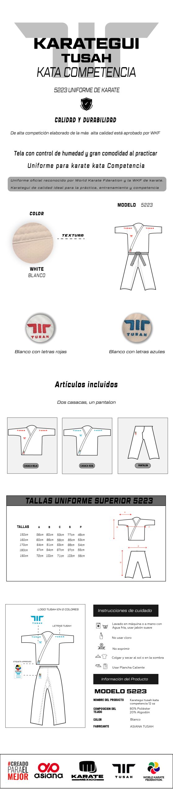 Uniforme de 12 oz, ideal para la práctica y competencia de kata, brinda una excelente caída, firmeza y definición en cada técnica. Su tela permite una adecuada transpiración, ofreciendo comodidad, resistencia y presencia marcial durante el entrenamiento o presentación.